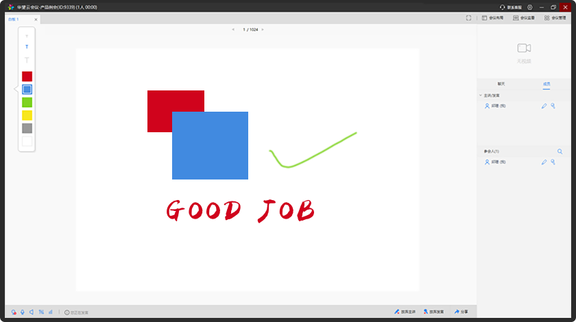 具备电子白板功能,支持画笔、文本编辑、图形等多种工具,支持office办公文档,包括word、excel、PPT、pdf,还有影音视频文件、应用程序共享。