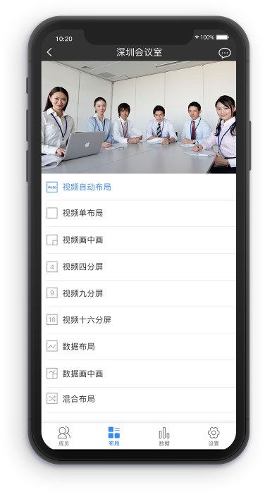 在手机app 上可对会议的权限、布局进行控制,简单方便的远程协作体验。